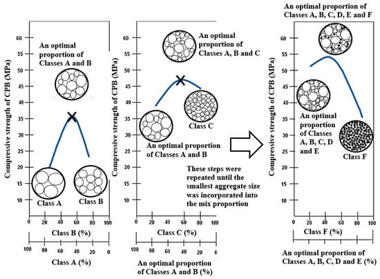 Chu et al. [] showed that the packing density was the critical factor that influences the CPB’s properties, regardless of the aggregate type, which allows a better understanding of the characteristics of the concrete’s components. For an advanced packing optimization, the aggregates were classified into six classes (A, B, C, D, E, and F) according to their size ranges (A: 5–10 mm, B: 2.36–5 mm, C: 1.18–2.36 mm, D: 0.6–1.18 mm, E: 0.3–0.6 mm, and F: 0–0.3 mm). The materials were sequentially introduced into the mix, from the coarsest to the finest. A detailed procedure is presented in Figure 5.