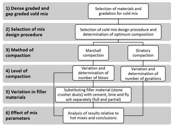 Dash and Panda [] highlighted that higher compaction should be avoided in the cased of both Marshall and gyratory compaction. It may influence a decrease in the cold AC’s workability. Then, a greater compression level can be challenging to apply in the field. The cold mix-design procedure is shown in Figure 6.