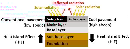 In the USA, in summer, the surface temperature on AP increased to 70–80 °C in Phoenix, Arizona, rising up to 70 °C in Davis, California, and contributing to the HIE []. Then, a strategy to reduce the HIE uses the ICBP’s water retention potential. The water absorbed by the pavement can be evaporated gradually, which decreases the surface temperature by 10–20 °C compared with an AP []. Another strategy to counterbalance the HIE is the development of cool AP (Figure 7), presenting a high thermal emissivity with less heat absorbed []. The new AP has a typical albedo of 0.05, and with a 0.6 increase; the daytime pavement surface temperature was reduced by 20 °C [,].