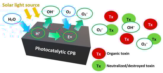 The photocatalytic CPB application is an innovative ICBP technology for reducing pollutant emissions. Fujishima and Honda [] describe the mechanism of the photocatalytic reaction of titanium dioxide (TiO2). Figure 8 shows the photodegradation of organic toxins under light energy. Then, \photocatalytic concrete in urban areas can reduce the air’s nitrogen oxides (NOx) concentration. Witkowski et al. [] and Beeldens [] studied CPB performance with TiO2 in air purification measured as NOx reduction through laboratory and field tests.