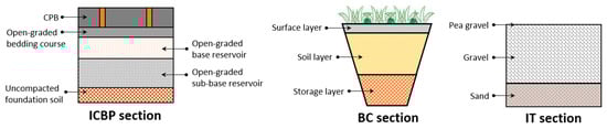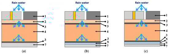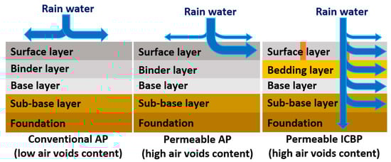 Porous AP is a typical permeable structure, but early failure due to a lack of fine materials and clogging are the main problems for its use in urban design []. Then, permeable ICBP is becoming more popular because of its harmony with the environment and urban streets, and its potential for temperature reduction []. Figure 10 shows the runoff movements in conventional AP, permeable AP, and ICBP structures for light traffic, such as pedestrian walkways. The materials used in each layer absorb part of the runoff, which depends on its saturation degree, porosity, and permeability coefficient.