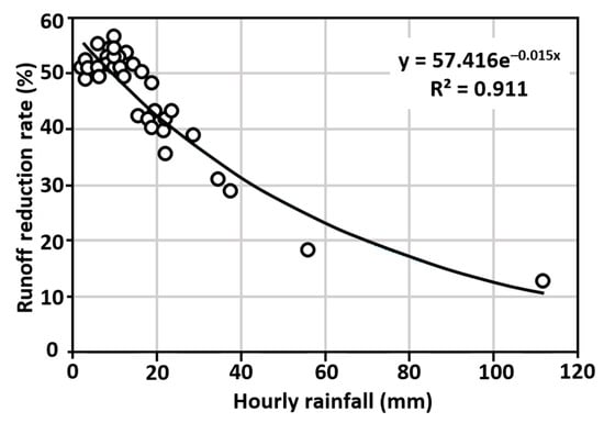 Relation between runoff reduction rate and hourly rainfall (adapted from []).