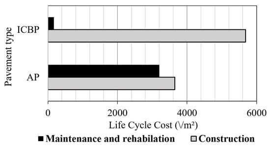 In urban areas, such as roads and parking areas, the land is usually covered with conventional AP, which is impervious and results in rainwater being directed to storm drains instead of the foundation through infiltration [,]. Furthermore, over 90% of pavements are AP in the USA []. Then, there are high AP surface temperatures during summer during hot periods. In addition, the increase in traffic density leads to a higher concentration of contaminants on the pavement’s surface layer. A solution for these problems is the application of ICBP because of its potential for temperature reduction, stormwater management, and the retention of contaminants [,]. This solution positively influences the Life Cycle Assessment (LCA) to evaluate the sustainability and economic advantages of the complete structure.