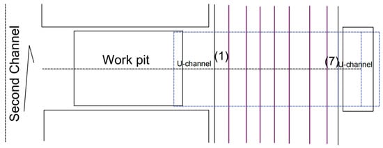 The process of frame culvert with soil jacking is mainly reflected in the excavation of soil and the contact analysis of the box culvert and soil in the numerical simulation. The friction coefficient is taken according to the site survey report, and the normal contact is “hard contact” []. Considering the convergence of the calculation, the model adopts activation of the box culvert at the corresponding position to simulate the jacking process, while the soil in contact with the outer surface of the box culvert applies a surface load to simulate the friction force generated by the box culvert jacking on the soil. The value of the friction coefficient, friction force calculation reference [,], the friction coefficient in the finite element calculation are taken as 0.3, 0.5, and 0.7 at the top, side plate, and bottom plate of the box culvert, respectively, and the three normal forces on the soil body are the self-weight of the overlying soil body, the active earth pressure borne by both sides, and the self-weight of the overlying soil body plus the self-weight of the box culvert, respectively. The friction force acting on the soil at the outer wall of the box culvert is 9.68 kPa at the top plate, 24.75 kPa at both sides of the plate, and 46.52 kPa at the bottom plate, which is applied to the soil at the outer wall of the box culvert according to the uniform load, while the friction direction is the same as the top-in direction. After the simulation is completed, the corresponding settlement displacement values of the roadbed and track can be extracted by creating paths. Since the top course of the box culvert is long, seven different working conditions are selected as shown in Table 2.