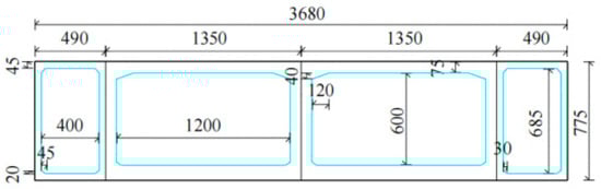 This paper relies on the Ningbo Hengshan Road leveling project, corresponding to the line center mileage K182 + 218.65, line reinforcement construction range K182 + 180~K182 + 250, 70 m long, hole span arrangement for 4 m + 12 m + 12 m + 4 m, frame culvert under the railroad 7 is shared, and the existing railroad is orthogonal, track number 1 to 7, the top direction from 1 to 7. Figure 3 shows the construction plan layout diagram. The net height of the 4 m frame in the frame body is 6.85 m, and the top plate, bottom plate, and sidewall are 0.45 m thick; the net height of the 12 m frame is 6.0 m, the top plate, and side wall is 0.75 m thick, the bottom plate is 1.0 m thick; the length of a frame is 41.5 m. The size of the frame culvert is shown in Figure 4 and the size unit in the figure is cm.