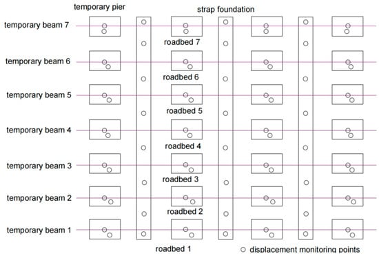 In order to effectively predict and analyze the settlement deformation of the track and roadbed during the construction process and ensure the safe and smooth completion of the box culvert jacking construction, site monitoring becomes an indispensable part of the project. Considering the actual situation on site, the monitoring points are arranged as follows: four monitoring points are arranged equidistantly on the temporary beam; one monitoring point is arranged on the temporary pier; one monitoring point is set at each end of the strip foundation, and one monitoring point is set in the middle of each of the two tracks in the middle of the strip foundation. The plan layout of the monitoring points is roughly displayed in Figure 5.