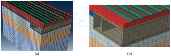 Considering the boundary effect, the plane size of the overall model is 80 × 44 m, the height is 50 m from the roadbed surface to the bottom of the soil layer [,], the top surface of the model is free, the surrounding boundary is a horizontal constraint, the bottom surface is a three-way constraint, the symmetry surface is a symmetry constraint. The frame culvert structure is simulated by solid units, and the bed adopts wedge-shaped units, with an approximate global size of 4 and several individual component units of 120; the track, rail sleeper, frame, and roadbed soil layer all adopt hexahedral units, with the approximate global size of 1, 0.5, 2, and 2, with the number of individual component units of 1440, 12, 2329 and 20,160 respectively. A schematic diagram of the model is shown in Figure 6.