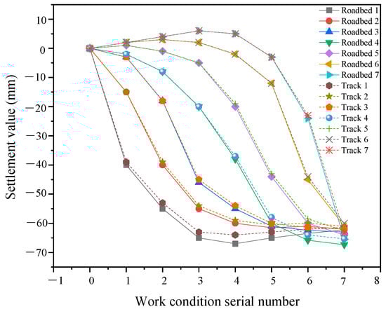 The longitudinal direction of the roadbed and track is indicated perpendicular to the direction of the roadbed or track travel. To explore the settlement law of each roadbed and track section under different working conditions during the jacking process of the box culvert, the maximum settlement values of roadbed and track under each working condition in the model are selected and plotted according to the order of working conditions, as shown in Figure 7.