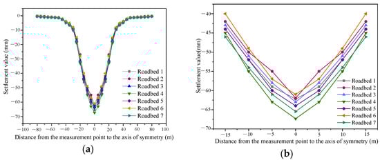 Roadbed and track transverse are said to be parallel to the direction of the roadbed or track travel. In order to explore the transverse settlement law of each roadbed cross-section, the model is selected at the end of the working conditions of each roadbed transverse settlement and the values plotted to give the roadbed transverse settlement curve as shown in Figure 8. From Figure 8 it can be seen that after the end of jacking, the final settlement curve of each roadbed cross-section is approximately the same, all are in line with the form of a Gaussian curve; the maximum settlement interval of the roadbed is (−61 mm, −68 mm), the main settlement range interval is (−40 m, 40 m).
