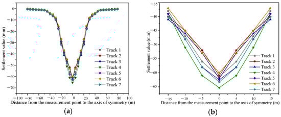To investigate the transverse settlement law of each track, the transverse settlement value of each track after the end of the working condition in the model is selected and plotted, while the transverse settlement curve of the track is shown in Figure 9. It can be seen from Figure 9 that after the end of jacking, the final settlement curve of each track transverse section is about the same; all conform to the form of a Gaussian curve; the maximum settlement interval of the track is (−60 mm, −66 mm), and the main settlement range interval is (−40 m, 40 m).