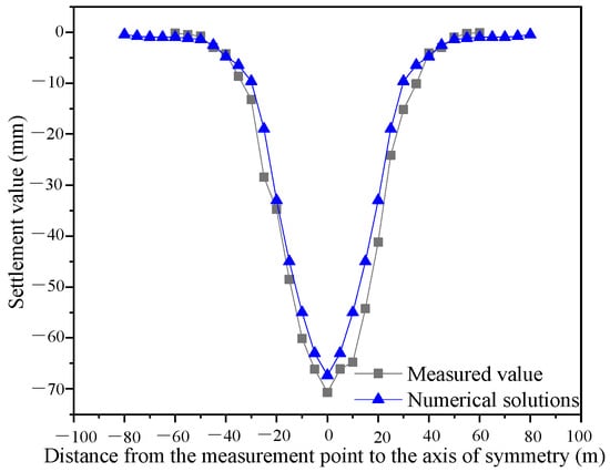 In order to study the track settlement law of the numerical model, the actual measured data of roadbed 4 and roadbed 7 are selected to compare and analyze with the numerical simulation results, while the numerical analysis simulation results are called numerical solutions. Roadbed 4 is located at the midpoint of the entire topping area and is most obviously disturbed by the box culvert topping; the settlement of roadbed 1 is affected by both the excavation of the adjacent pit and the box culvert topping, while the settlement of roadbed 7 is only caused by the box culvert topping, which better reflects the change of roadbed settlement caused by topping. Therefore, the measured data of roadbed 4 and roadbed 7 were selected for comparison.
