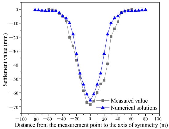The measured data of roadbed 4 and roadbed 7 are plotted with the numerical solution of the final settlement obtained at the end of the numerical jacking simulation, as shown in Figure 10 and Figure 11, respectively.