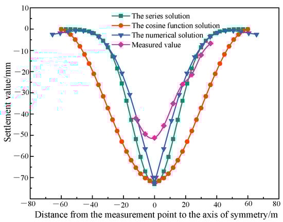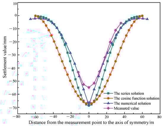 Note: The solution calculated by the theoretical model of the orbit in this paper is the series solution, the solution obtained by the model test in the literature [] is the cosine function solution, the settlement of the orbit in the numerical simulation results is the numerical solution. The numerical solution, the series solution, and the cosine function solution are three different results of the solution of the orbit settlement curve.