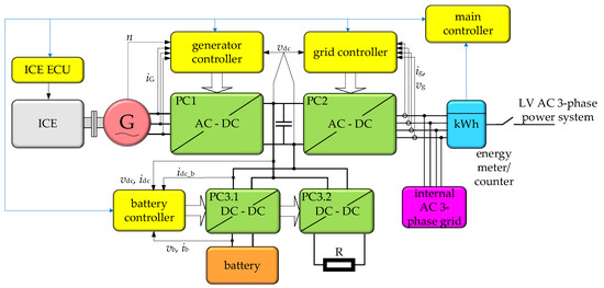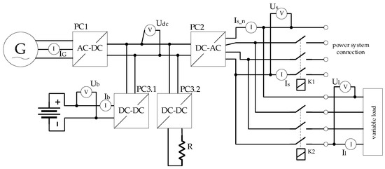 The characteristic feature of the system is the use of two AC–DC power converters (power grid PC2 and generator PC1) and one DC–DC battery converter with a dual-active-bridge (DAB) structure (PC3.1). In addition, a DC–DC buck–boost converter (PC3.2) was installed. PC3.2 discharges excess electricity when the battery voltage and current limits are reached during charging. The voltage of the DC bus between the converters is approx. 710 V. The nominal voltage of the battery is 48 V. The selected value of the battery voltage is due to practical reasons. The device will be operated by persons without appropriate qualifications to work on electrical installations. However, the user should be able to safely disconnect and reconnect the battery during routine service work. In on-grid mode, the DC bus voltage is stabilized by the PC2 grid converter, and the battery and PC3.1 and PC3.2 converters are not used. In the off-grid mode, the voltage on the DC bus is stabilized by the PC3.1 and PC3.2 power converters.