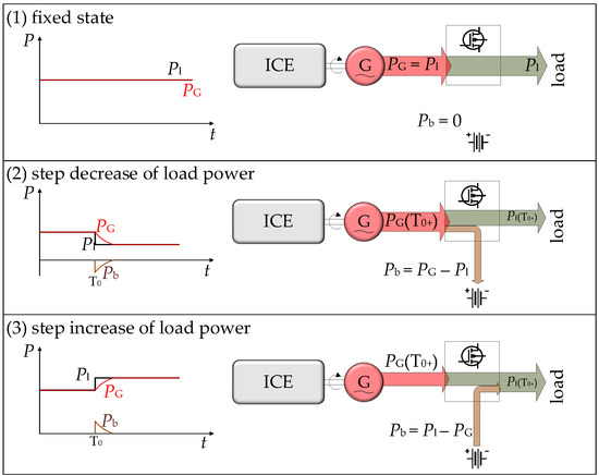 The time taken to establish a new operating point of the generator power system in response to a change in load power depends on: (1) the available battery power (and this depends on the capacity); (2) the throttle drive response time; (3) the oversupply of drive motor torque. The change in the drive power of the ICE can be forced in two ways: (1) a change in the fuel dose; (2) a change in the rotational speed. It is possible (and desirable) to use both methods simultaneously in order to obtain the highest possible active power control dynamics.