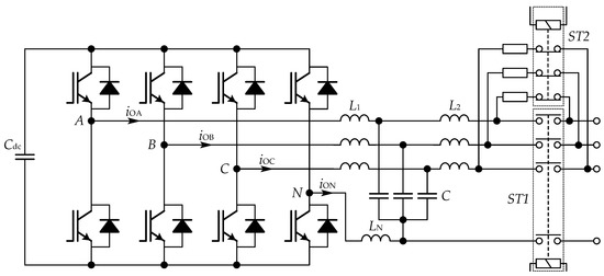 The most commonly used two-level four-leg topology was selected for the construction of the PC2 power network converter. The four-leg topology is required due to the unbalanced load and the need to regulate the voltage in each phase separately. Figure 3 shows the selected topology of a four-leg DC–AC converter with an LCL filter and two contactors, ST1 and ST2. ST1 is the main contactor and ST2 is the starting contactor. An important feature of the four-leg converter is that the voltage in the DC circuit should exceed the value of the phase-to-phase voltage amplitude of the grid. Since the grid voltage amplitude is √2 400 V = 565 V, it is assumed that Vdc must be higher than 600 V.