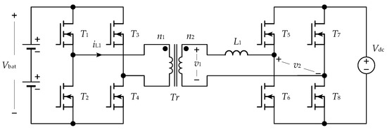 The battery converter is a bidirectional DC–DC converter, which is designed to convert the low voltage of the battery (48 V or more) into the DC circuit voltage of 600–800 V. The value of this voltage depends on the number of legs of the grid converter. Such a large voltage ratio (700 V/48 V ≈ 14.6) makes the use of a bidirectional non-separated DC–DC buck–boost converter unjustified, due to the need to switch transistors with a very high duty cycle. A DAB converter was used in the project, a diagram of which is shown in Figure 5.