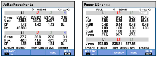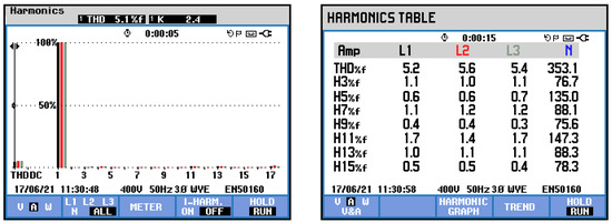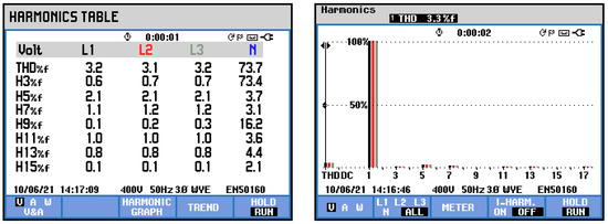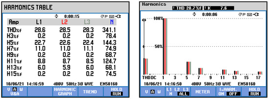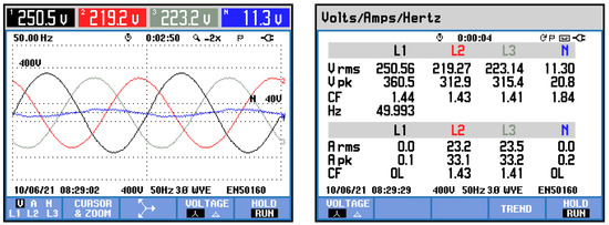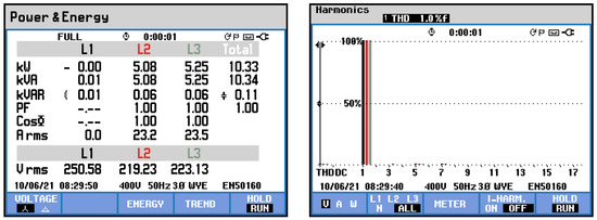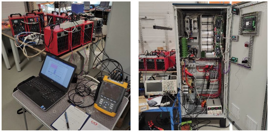 A scheme of the laboratory stand, with marked measurement points, is shown in Figure 6. A view of the measurement stand with the power electronic system installed in the cabinet is shown in Figure 7.