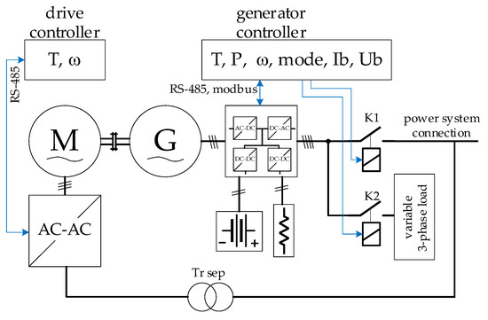 The induction motor, M, was powered by an inverter. The inverter is controlled by specifying the torque or rotational speed of the motor. The generator converter system is controlled by setting the power at the connection to the network (only in on-grid mode), the load torque or the rotational speed of the induction generator G, as well as the on-grid or off-grid operating modes. It is also possible to limit battery current and voltage. The motor and the generator system are connected to the same grid, therefore, a separating transformer Tr_sep was used to power the drive motor.