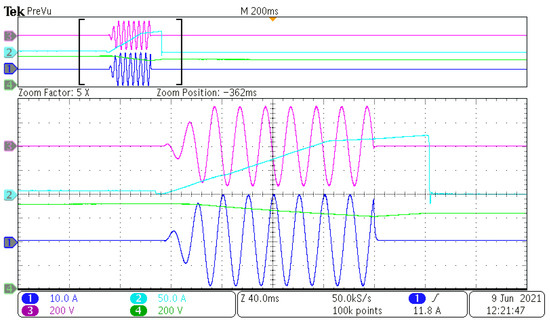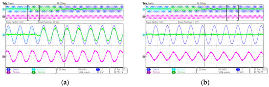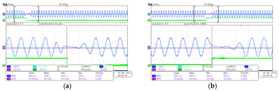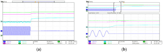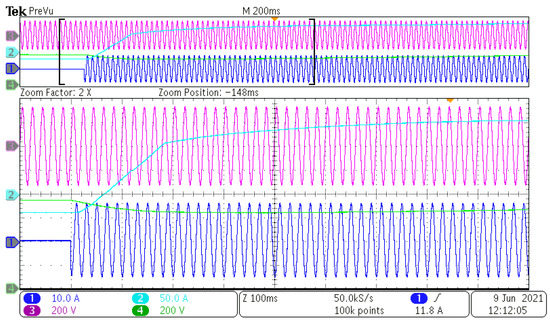 On the low-voltage side (battery voltage) 150 V MOSFET transistors are used (IXFN400N15X3, IXYS Corporation, Milpitas, CA, USA). On the high-voltage side (DC bus voltage), IGBT transistors with a voltage class of 1200 V are used (FF50R12RT4, Infineon Technologies, Neubiberg, Germany). The turns ratio of the transformer, Tr, is n1/n2 = 1/14.6.