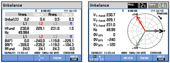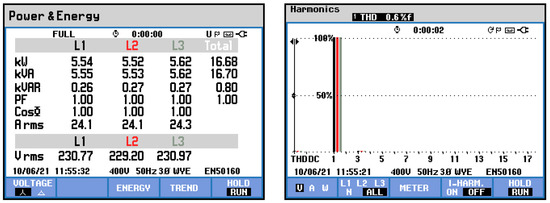 - Load: (1) adjustable resistive unbalanced load with a power of 16.5 kW, consisting of 9 resistors with a power of approx. 2 kW each. The resolution of the load power regulation is approx. 0.5 kW for each phase separately. The load power value is true for the rated phase voltage of 230 V; (2) non-linear load: three-phase 6-pulse rectifier with resistive load.
