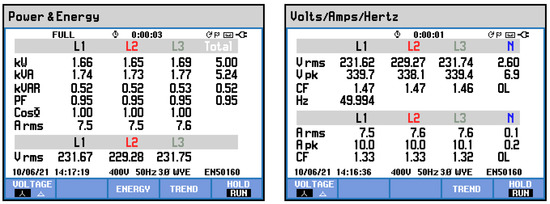 - off-grid operation: (1) measurements of the values of the generated phase voltages and active power at symmetrical and asymmetric resistive loads and non-linear loads; (2) measurements in transient states with changes in the load power values-during the tests, the load power values were changed step by step and the generator power regulation time and battery current were measured. The battery voltage and current limits were also tested.