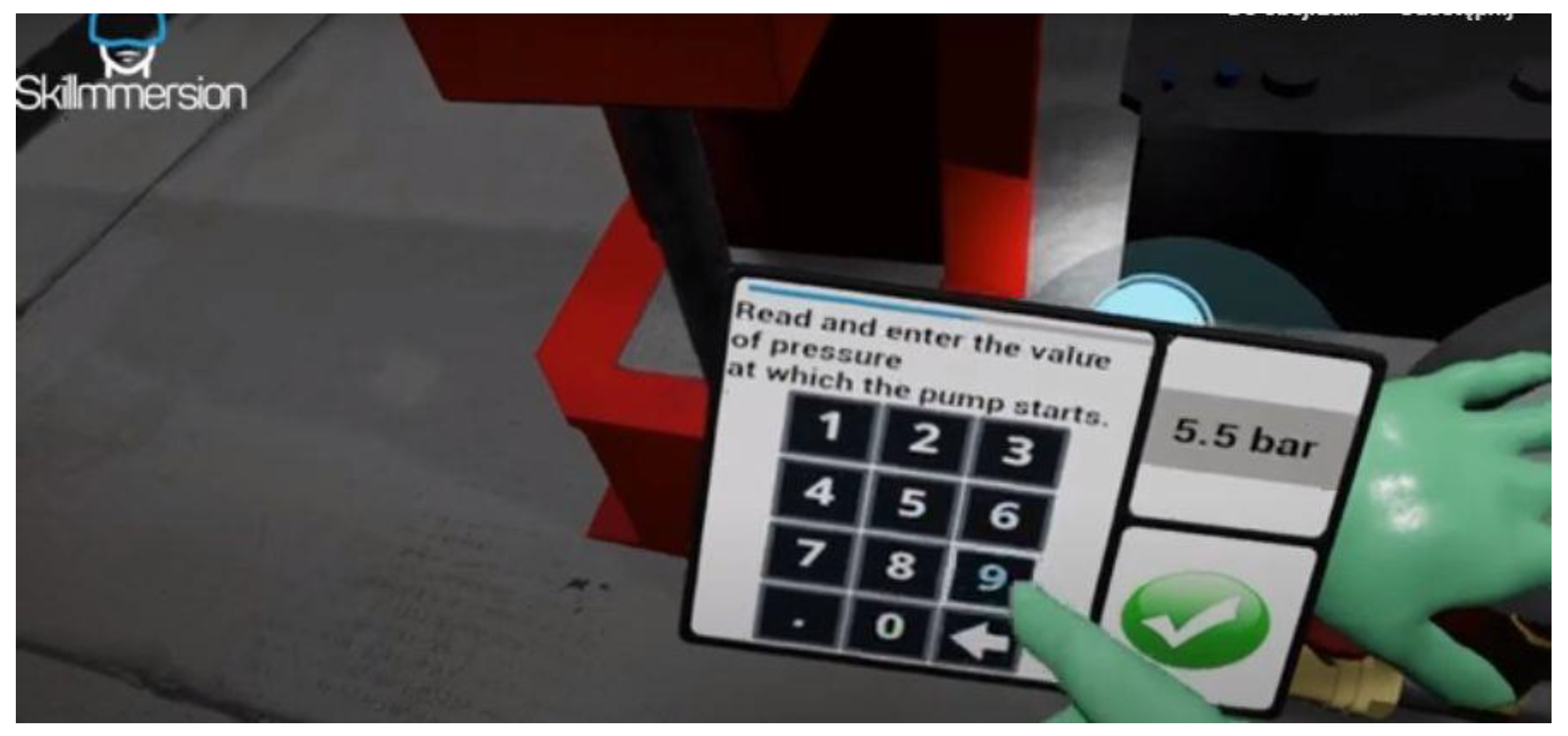 Each module was designed as a virtual room of 80 × 30 m with a minimum of 50 activity points and 30 FM tasks. After completing the initial training in the use of tools and moving around in the VR environment, the training participant proceeded to undergo fundamental training on the fire pump station (