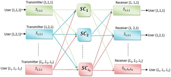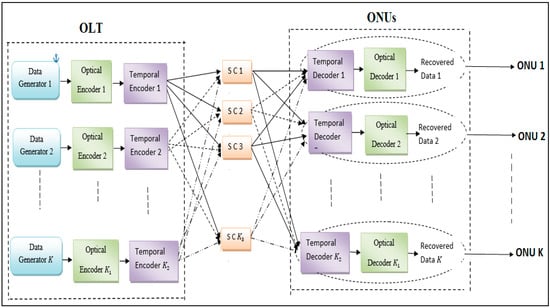 Table 5 elucidates how to encode and decode in three dimensions, spectral, temporal, and spatial, when there are eight users and an appropriate code word for each of them. Let us take the third user as an example: it needs an encoder or, in other words, one filter, for () spectral encoding. Later, a filter should be linked to the second delay line (). Finally, the delay line should be linked to the first SC (). Using these links, the three-dimensional encoding is obtained; it is shown in more detail in Figure 15 (system schemes). The three-dimensional decoding operation is the opposite of the encoding operation.