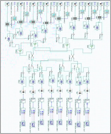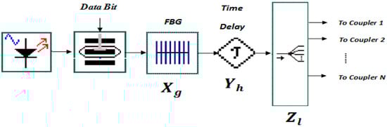 The OLT of our proposed system contains transmitter units; in our case, there are eight units, and each one of them contains a pseudorandom bit sequence (PRBS) generator, non-return to zero (NRZ), and a white light source (WLS) that is responsible for the generation of optical bandwidth. It is bonded with a Mach–Zehnder Modulator (MZM), which functions as a signal transformer that transforms electrical signals into optical signals. Additionally, each unit contains the components specified for spectral and temporal encrypting techniques, which are FBGs and delay lines, respectively.