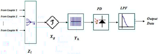 Finally, the delay line output is sent to the FBG to decode the data spectrally; it reflects back the components of spectral code sequence that correspond to ‘’. Additionally, the reflection helps to compensate for the run-trip delay. Lastly, the PD detects the reflection and converts the optical and decoded signal into an electrical signal, and the low pass filter (LPF) filters it.
