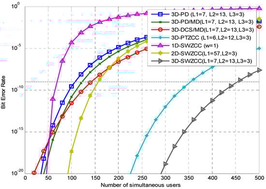 Figure 4 shows the BER alteration as a function of the number of simultaneous users for set parameters, such as a received power of −10 dBm and a data rate of 1 Gbps. As shown, our proposed code can accommodate a greater number of users, up to 454, while the 1D and 2D cases can accommodate just 68 and 157 users, respectively. As a result, the system cardinality has been optimized by about 6.67 and 2.89 times from transitioning from 1D to 3D and from 2D to 3D, respectively. Additionally, the OCDMA system based on the 3D-SWZCC code has outperformed the 3D-PD, 3D-PD/MD, 3D-DCS/MD, and 3D-PTZCC codes, for the same code lengths, by about 4.24, 3.72, 3.22, and 1.32 times, respectively, where the system cardinality for each code is 107, 122, 141, and 354 users, respectively. This means that the system can potentially meet the demands of optical networks.