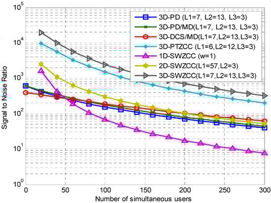 For K < 50, the curves of the codes that belong to ZCC families (1D, 2D, 3D-SWZCC, and 3D-MD codes) [3,15,25] have greater SNR values than the others. Beginning from K < 50, the SNR of the 1D-SWZCC code decreases rapidly; meanwhile, the SNR of the 2D-SWZCC code keeps outperforming the SNRs of the other codes until K ≥ 200, where its values become less than the SNR of the 3D-DCS/MD code.
