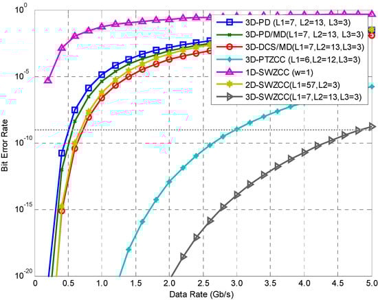 This section mentions the effects of moving from two-dimensional (2D) to 3D SWZCC code. Further, the code is compared with 3D-perfect difference (3D-PD), 3D-hybrid perfect difference/multi-diagonal (3D-PD/MD), 3D-hybrid dynamic cyclic shift/MD (3D-DCS/MD), and 3D-Pascal’s triangle ZCC (PTZCC) codes [1,22,23,24] for the same spectral, temporal, and spatial code lengths, which are (= 7), (= 13) and (= 3), respectively. The parameters applied for numerical analysis are listed in Table 3.