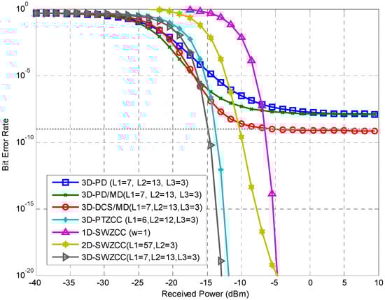 Figure 7 displays the BER alteration as a function of the received power for 150 active users and a data rate of 1 Gbps. For dBm, all codes have roughly the same performance; in other words, all OCDMA systems tested in this investigation are the same in terms of the BER, referring to the restriction case for curves. On the other side, the curves of the 3D-PD and 3D-PD/MD codes and even the 3D-DCS/MD code vary speedily from dBm, and they do not have the ability to achieve the BER floor due to the intense influence of PIIN. Nonetheless, the latter can achieve the BER floor, but with difficulty, at dBm. Regarding the other codes, they start in variation until the BER floor is achieved at −6.6, −10.3, −14.9, and−13.8 dBm for the 1D, 2D, 3D SWZCC, and 3D-MD codes, respectively. In accordance with the above outcomes, employing our proposed code enables each user in the OCDMA system to require only minor power at the receiver level and saves around −9.1 and −1.1 dBm compared with the 3D-DCS/MD and 3D-MD codes [24,25], respectively. In addition, the transitions from 1D to 3D and from 2D to 3D save around −8.3 and −4.6 dBm, respectively.