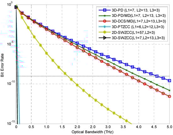 The fifth parameter to be discussed in this investigation is the BER alteration, which is shown as a function of the optical bandwidth for 100 active users in Figure 8. It is plain that the 1D-SWZCC curve is not drawn, since its ZCC feature and its SNR expression do not include the ‘∆f’ symbol. For the BER threshold, our proposed code can satisfy optical communication needs with an optical bandwidth of 0.03 THz, while the 3D-PD, 3D-PD/MD, 3D-DCS/MD, 3D-PTZCC, and 2D-SWZCC codes [1,3,22,23,24] force the OCDMA system to access optical bandwidths of 4.6, 4, 3.7, 0.07, and 1.68 THz, respectively. Employing the 3D-SWZCC code enables the OCDMA system to decrease its use of the bandwidth of the light source by 4.75, 3.97, 3.67, and 0.04 THz compared with the 3D-codes PD, PD/MD, DCS/MD, and PTZCC, respectively; additionally, 1.65 THz of bandwidth is saved by moving from 2D to 3D.