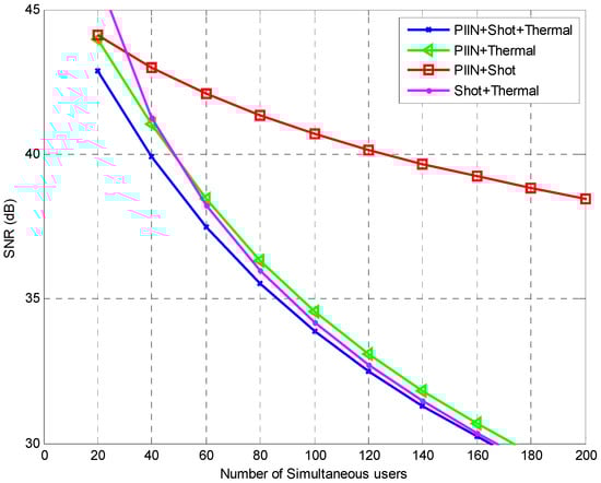 Figure 9 highlights the effect of each noise source on the QoS of our system for the electrical and optical bandwidths at 6.5 MHz and 5 THz, respectively. When we take into account the effects of all noise sources, the SNR is diminished and is almost the same for PIIN and thermal noise, with a constant difference that is the shot noise value, as shown by the blue and green curves. Additionally, when we ignore the effect of PIIN, the SNR also diminishes: it gives average values that are between those given by the PIIN and thermal noise curve (green curve) and the curve representing all noise sources (blue curve), as shown by the magenta curve when the number of users is greater than 50. The latter case takes into account both PIIN and shot noise while ignoring the thermal noise; in this case, the SNR will greatly increase, as shown by the red curve. Briefly, we have two cases that have approximately the same results. From this, we can deduce that the OCDMA system is most affected by thermal noise. Further, one can neglect PIIN as well; the SNR is most affected by thermal noise and is not affected much by shot noise. The above result, which demonstrates the low effect of PIIN, comes from the zero cross-correlation feature of our proposed code. These results have been discussed based on the dB values of the SNR as a function of the number of simultaneous users.