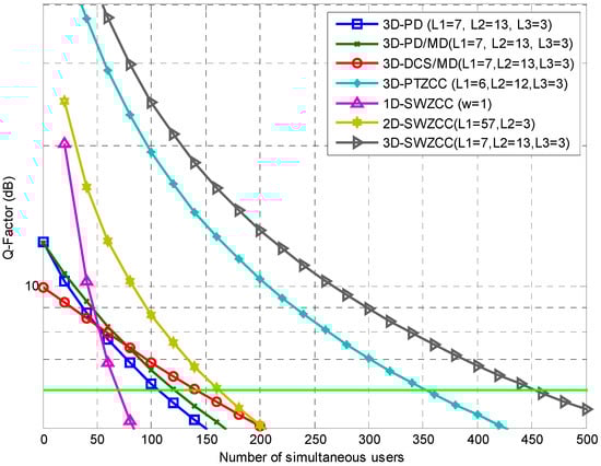 Using Equation (24), the Q-factor alteration as a function of the number of simultaneous users is plotted for a data rate of 1000 Mbps, as depicted in Figure 10. When the number of users increases, the Q- factor decreases, which demonstrates the negative correlation between them, in contrast to BER and ‘K’. At an agreeable Q-factor value for optical communication, which is given by 6 dB, the OCDMA system cardinality is 454, 354, 157, 141, 122, 107, and 68 for the 3D-SWZCC, 3D-MD, 2D-SWZCC, 3D-DCS/MD, 3D-PD/MD, 3D-PD, and 1D-SWZCC codes, respectively [3,15,22,23,24,25]. From this, it is clear that the results shown in Figure 10 match the results shown in Figure 4. Therefore, we can say that it is possible to utilize Q-factor or BER criteria to estimate the system performance. On the other side, the total code length of the 3D-SWZCC code amounts to 273 for , and , with K = 454.