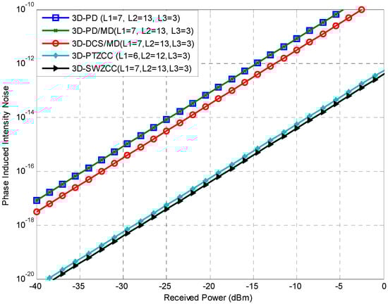 In contrast, as cleared in Figure 13, the current dark noise is a function of effective source power where it is observed that the significant effect caused by PIIN on OCDMA system uses the 3D codes: PD, hybrid PD/MD, and DCS/MD. Furthermore, these codes suffer from fixed in-phase cross-correlation in spite of the high auto correlation values. However, due to the characteristics of our code which provided a high auto correlation and zero cross-correlation, the MAI is totally suppressed, and the PIIN is reduced, which reduces the value of the dark current noise.