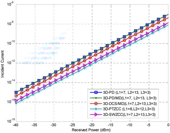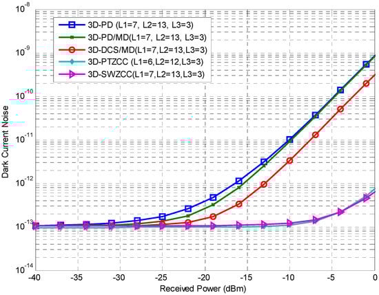 PD output current and dark current noise alteration as a function of received power as shown in Figure 12 and Figure 13, respectively. It is observed that the variation of output PD current with an effective source power of 3D-SWZCC code is smallest compared with 3D codes: PD, hybrid PD/MD, and DCS/MD whereas the 3D-PTZCC code is less than our proposed code. This is due to these codes using the AND detection technique at the receiver level, whereas our code and the 3D-PTZCC code are using the SDD detection technique. As it is known, the AND detection technique permits the implementation of a specific filter for each wavelength which increases the signal quality. However, it is enough to implement a single filter whatever the code weight in the SDD detection technique. So, the power of the signal resulting from the SDD technique is less minor than the AND technique. Moreover, the AND technique needs to use eight PDs, but the SDD technique needs just a single PD. Consequently, the SDD technique minimizes the OCDMA system complexity based on the 3D-SWZCC code up to 75% compared with the OCDMA system using the 3D codes: PD, hybrid PD/MD, and hybrid DCS/MD.