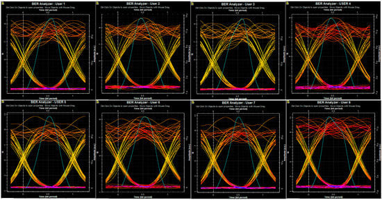 In accordance with the aforementioned results in Figure 14, the fact that the eye diagrams of different users are not the same means that the BER and Q-factor values are also different. These phenomena can be explained by several factors: