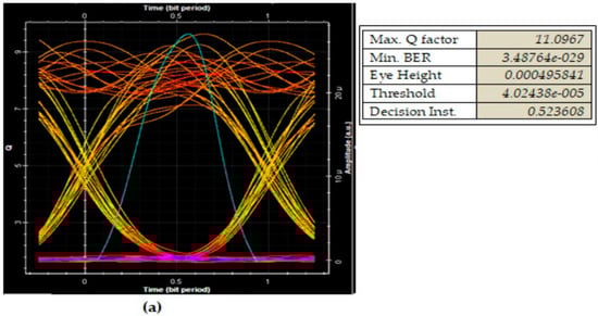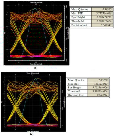 Consequently, we note that both the Q-factor and BER values do not override their sills (Q = 6 dB, BER = ); they should be, respectively, greater than 6 dB and less than . Additionally, the system performance can be evaluated through the opening of the eye diagram, because if it extends over a wider range, this denotes the diminishing of MAI and indicates that the system has better performance and vice versa.