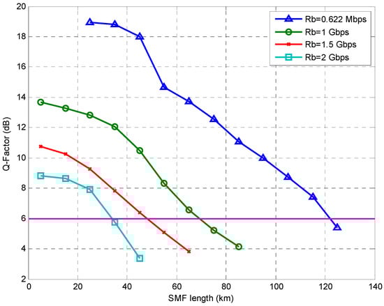 Figure 18 shows the SMF length variation compared to the Q-factor. It is clear that if the length of the SMF increases, the Q-factor will be diminished, which signifies that the relationship between them is an inverse relationship. Furthermore, the optical fiber dispersion also influences the system performance. Due to the fact that each user exploits a high data rate, estimated to be 0.622, 1, 1.5, and 2 Gbps in the four different cases, it is remarkable that the SMF length of our proposed system, for acceptable BER, reaches 122, 69.2, 48.4, and 33.8 km, respectively. Similarly, it is very clear that our code satisfies the requirements of optical communication systems.