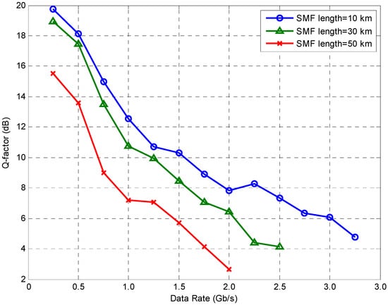 Q-factor versus data rate for the SMF lengths 10, 30, and 50 km.