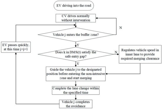 The above control process is represented by the flowchart in Figure 3. When multiple CVs are in front of the EVs, the guidance control is performed sequentially according to the flow to form a loop. Due to the complex coupling between vehicles and traffic flows, vehicles in mixed traffic flows have unique dynamics and uncertainties. To this end, the following assumptions were made: (1) CVs have a random slowing phenomenon and arrive uniformly. (2) EVs do not change lanes and drive at the desired or maximum drivable speed. The speed is within a certain interval that exceeds the CV’s expected speed. (3) The CVs participating in the interaction obey the guidance signal. (4) The traffic flow composed of CVs is relatively stable and does not reach saturation. (5) Each CV selects a lane change to avoid the EV instead of accelerating.