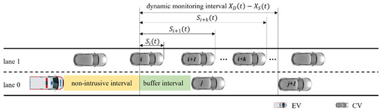 We set a non-intrusive interval of length at the front end of the EV to ensure driving safety and to make the EV prioritize the right-of-way space. The interval value is related to the EV’s speed and the front CV’s speed and should be determined based on the speed of both [16]. In addition, a buffer interval of length was appropriately set before the no-intrusion interval. When the CVs ahead of the EVs enter the buffer, it is necessary to request them ahead to change lanes in time for them to pass quickly. As depicted in Figure 1, since the EV’s speed exceeds the CVs’, the front CVs should complete a lane change before entering the non-intrusion zone. Among them, CV vehicles are equipped with sensors, controllers, actuators and other devices, and incorporate modern communication technologies that are capable of exchanging information between vehicles and X (vehicles, roads, people, etc.) through sensing, decision-making, and collaborative control functions. Subsequently, the physical meaning of the non-intrusive zone is the safe-following distance that CV vehicles are not allowed to enter, which is adjusted according to the vehicle’s speed in front and behind. The physical meaning of the buffer zone is the perceived space of the EV, for a buffered lane change for CV vehicles, thereby reflecting its right-of-way priority privilege, which is adjusted according to the traffic state. The lengths of the non-intrusive and buffer zones could be flexibly and dynamically adjusted to suit various traffic scenarios. Obviously, EVs can obtain the priority right-of-way space in this process.