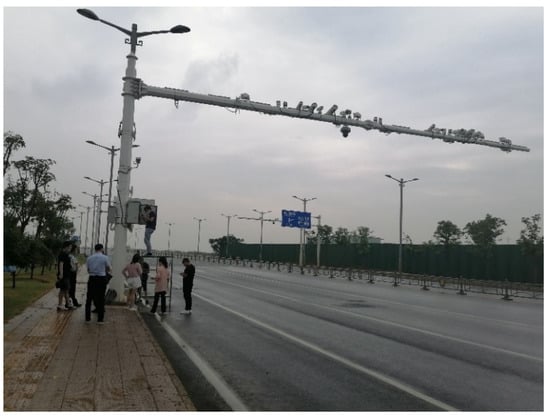 To evaluate the performance of the proposed control model in the actual traffic environment, this paper selected Qinghua Road in Wuhan City, Hubei Province, as an actual case for discussion and research. Qinghua Road starts from Qingwang Road in the west and ends at Huashan Avenue in the east, with a total length of about 12 km. It is an essential urban road between the East Third Ring Road and the East Fourth Ring Road in Wuhan. As demonstrated in Figure 7, Qinghua Road is a two-way four-lane road. It is a major traffic road connecting the main urban area and the suburbs, thereby providing great convenience for the passing traffic in the east and west directions. At the same time, this road provides surrounding units and residents with fast travel and good traffic conditions, which are suitable for validating this study’s models and methods. Figure 8 depicts the vehicle infrastructure cooperation network architecture, and Figure 9 presents the microwave radar equipment installed on road sections to collect real-time road traffic data. The real-time traffic data collected by the radar is stored in a database so that SUMO can access the traffic data sources.