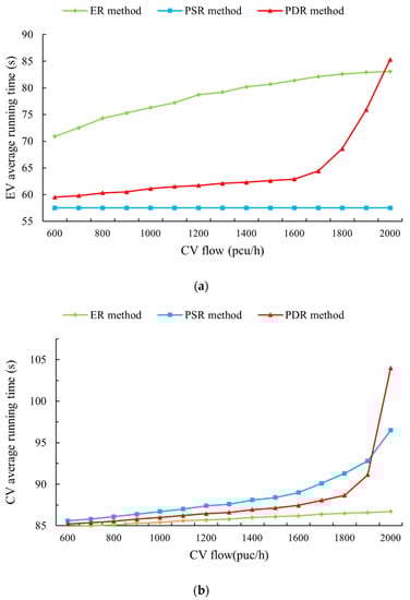 Effect of the CV flow on the running times of different vehicles: (a) EVs and (b) CVs.