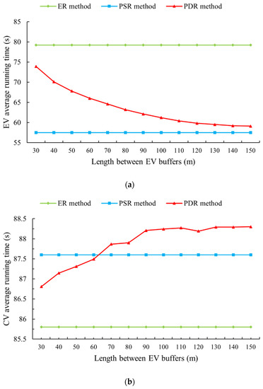 Figure 11 depicts the change curve vs. running time due to various buffer zone lengths in front of the EVs, which reflect the operating efficiency by the change in running time. The shorter the running time, the higher the efficiency when the length of the running section is the same. In addition, the mutual influence is reflected by comparing the trend of EV and CV running times under the same control method. It is worth mentioning that is not discussed in this study, because it is closely related to the vehicle’s driving state ahead, and the variation law is complex. To simplify the test process and obtain a relatively objective trend of the influence of the buffer interval length on the running time, was fixed at 15 m during the simulation, and the flow rate was fixed at 1300 pcu/h. In addition, varied from 30 m to 150 m to derive the variation rule [20]. Figure 11a,b reveal that the ER and PSR had a flat trend. Under PDR conditions, the EV’s running time curve presented a downward trend, and the CV’s running time showed an upward trend. The two aligned with the mutual influence mechanism on operating efficiency. Since EVs do not have physical functional areas under the ER and PSR conditions, which are unaffected by the inter-buffer length, the corresponding curves did not change with the inter-buffer length. In Figure 11a, when the length between the buffer zones exceeded 120 m, the PDR curve gradually tended to be flat and approached the PSR curve. When CVs cannot be imported, the operation effect is similar to PSR. The change in the PDR curve in Figure 11b was exactly opposite to that in Figure 11a, which reveals the result of CVs and EVs preempting limited road space resources. Therefore, when the CV’s flow rate is high, the buffer length should be reduced, and the efficiency of the CV’s operation can be enhanced.