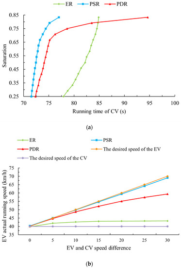 Since the ER and PDR methods compress the running space of CVs to different degrees, the saturation will increase. Figure 12a shows the relationship between the running time and the saturation of different organization methods, where the length of the non-invasive interval was , and the length of the buffer zone was . The flow input changed from 600 pcu/h to 2000 pcu/h. The saturation degree is the flow-to-traffic capacity ratio, with capacity set at 1200 pcu/h per lane. According to the traffic flow theory, the higher the saturation and speed, the greater the corresponding traffic capacity. Visibly, when the saturation is less than 0.8, the traffic capacity of the PSR method is the largest, followed by the PDR method, and the ER method is the smallest, but the traffic capacity corresponding to the PSR method is close to the PDR method. Although the PSR method has excellent advantages concerning traffic capacity, it requires many space resources. The plotted results in Figure 10b reveal that the space resources of the EVs compressed the CVs, declined the CVs’ operation efficiencies, and the PSR method had the most substantial impact on the other vehicles. Therefore, from the system point of view, the PSR method is not a method with better comprehensive performance. Since there is no lane change in the PSR method, the PDR method is a semi-free lane change (CV entry into the buffer requires a forced lane change), and the ER method is a completely free lane change, which also displays that the lane change has an adverse effect on the system, thus reducing the operating efficiency of the system. The results in Figure 12b indicate the effect of the speed difference between EVs and CVs compared to the actual EV operating speed, where the length of the two physical functional areas is depicted in Figure 12a, and the flow input was constant at 1300 pcu/h. The difference between the desired and actual EV speed under the ER method was the largest, thus indicating that EVs have the greatest resistance to travel under the ER condition and the greatest degree of impact on the EV’s operating efficiency. Then, without dedicated lanes (PDR method compared to ER method), the PDR method could significantly reduce EV driving resistance, and the operating effect was almost the same as the PSR when the speed difference was not large. It is not difficult to understand that the EV’s speed was reduced. Combining the above two sets of experiments, it is evident that, under the PDR method, when the EV’s speed is low, the length of the corresponding buffer zone should be reduced, and the corresponding saturation is high. When the EV’s speed is high, the corresponding buffer length should be increased, the saturation is low, and the buffer length and speed present a proportional trend.