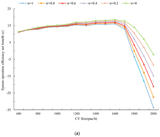 The above experiments reveal the interaction mechanism between EVs and CVs from different perspectives. However, the space resources on the road are limited. If the priority of EVs increases, the operating efficiency of the CVs must be reduced, thus showing a trend of trade-offs. In practice, the operating efficiency of EVs should be much higher than that of CVs. Noticeably, the operating efficiency of CVs is directly related to the operating efficiency of EVs. Figure 10a,b demonstrate the mechanism impacting the CVs’ lane change on the operational efficiency of roadway traffic. Therefore, in high-urgency emergency rescue missions, the impact of CVs on EVs can be reduced by adjusting CV lane change rates so that EVs can achieve a higher operational efficiency. In low-urgency emergency missions, the impact on CVs can be minimized while maintaining the efficiency of the EV’s’ operation.
